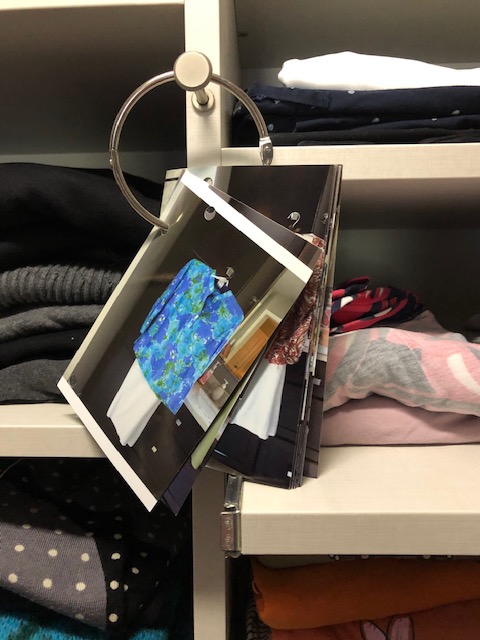 Mom admitted several years back, prior to moving in with us – that she no longer can put clothes together. Probably a tough thing to face, walking into a beautifully decorated closet and having a sense of loss. This is how we improved that. I was visiting that summer, we emptied the closet. Then the fun started! I put together outfits, laid each one out on the bed and took a picture. We added accessories too. This was a ton of fun for both of us. At the end of the day, I sent all the pictures from my phone to CVS to be printed. Once we had the pictures, I punched a hole in an upper corner and put them on a huge metal ring. we hung it in her closet as a “go to”. Geriatric Garanimals! Mom had her confidence back. Mission accomplished. (This is no relation to the Garanimals clothing line of the 70s, just an unveiled reference.)